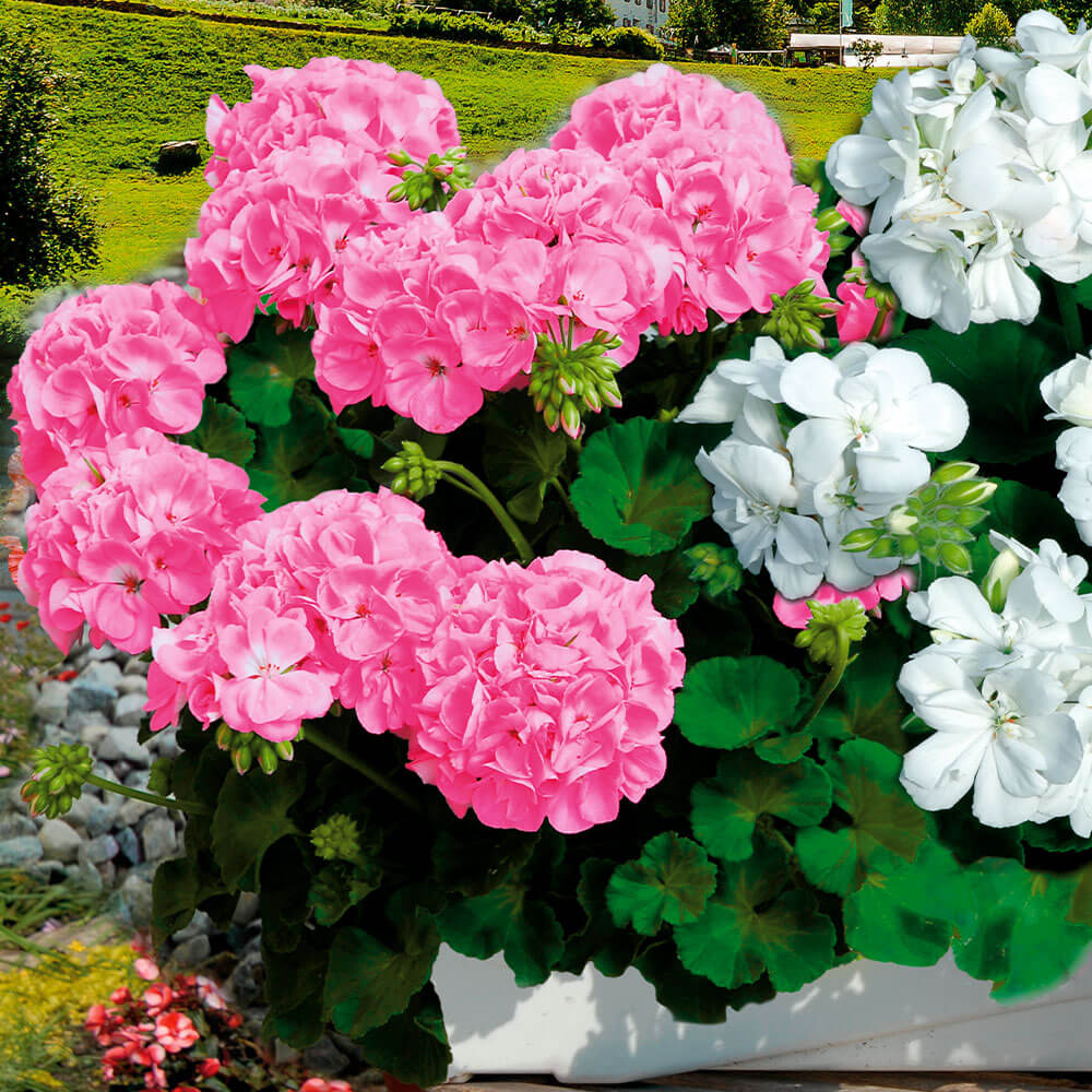 Csomag tartalma: 3 db A Sunrise Goesta állómuskátli nagy, feltűnő élénk rózsaszín, félig telt virágjával odavonzza a tekintetet. A sötétzöld lomb gyönyörű kontrasztot alkot a rózsaszín virágokkal. Balkonládák, virágcserepek, vagy akár virágágyások gyönyörű dísze lehet.Ellenálló, és könnyű ápolni. Napos vagy félárnyékos helyet kíván, és májustól egészen az első fagyokig virágzik. 40 cm magasságot érhet el.