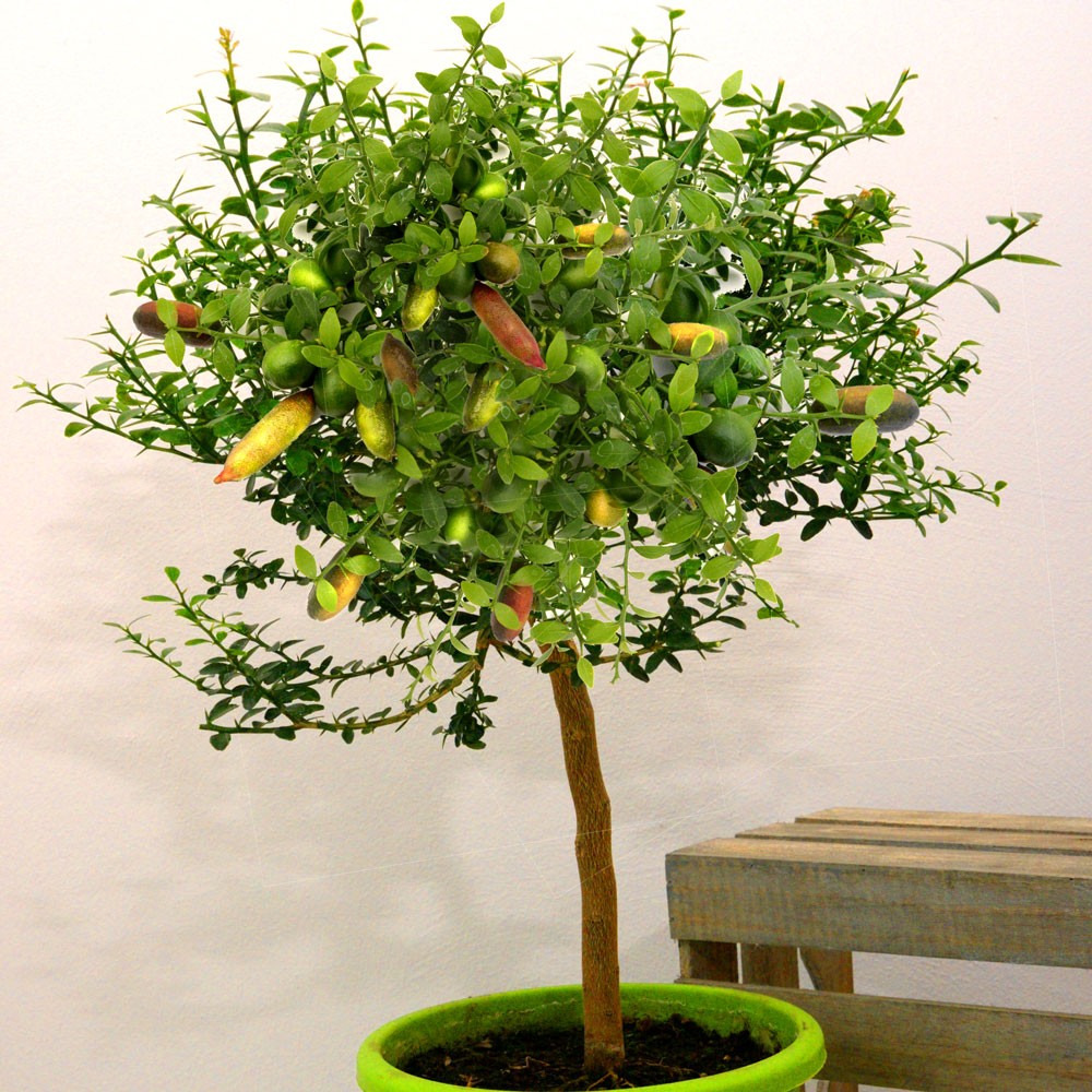 Csomag tartalma: 1 db Örökzöld apró levelek, sok száz színes gyümölcs. Könnyen kezelhető növény. 8 cm-es termése érettségtől függően változtatja színét. Amikor érett a termés, akkor mint a kaviár úgy pereg ki a gyümölcshús. Kellemes citromos aromát kölcsönöz ételeinek.