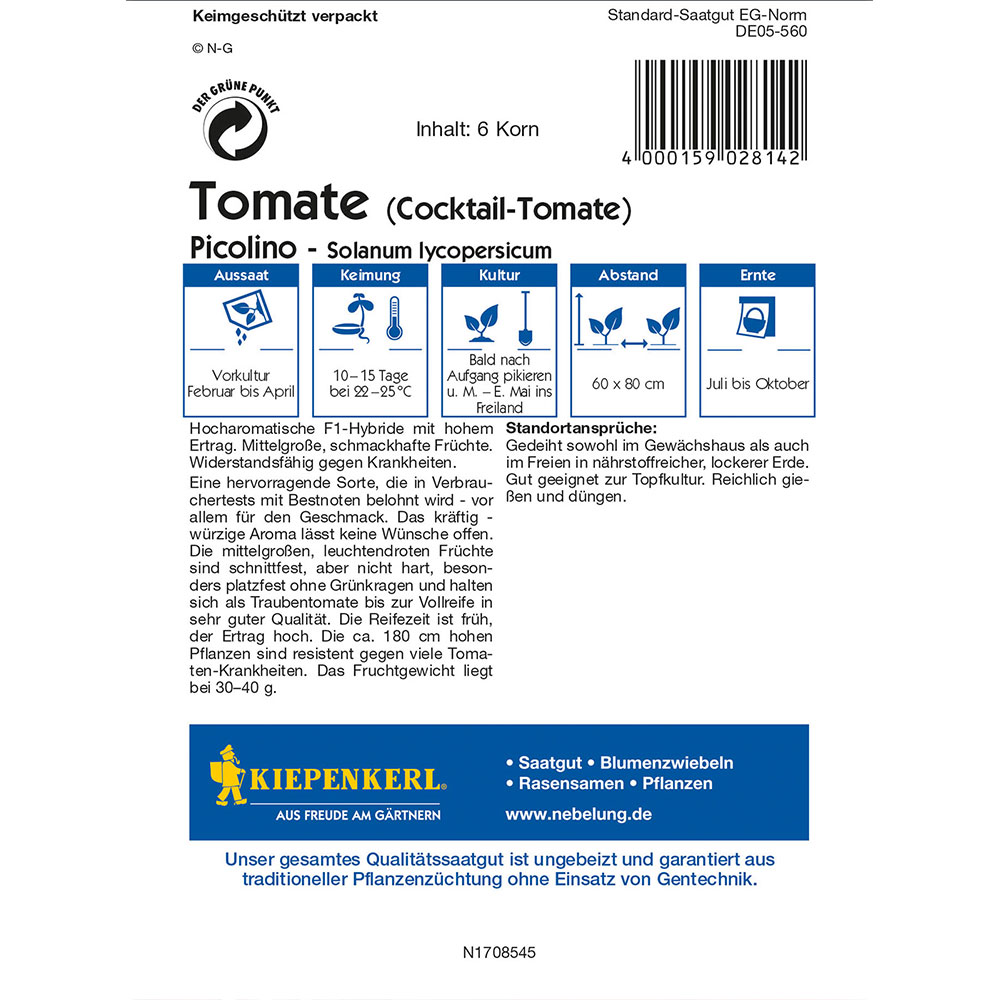 Csomag tartalma: 1 db A Picolino F1 koktélparadicsom fűszeres, édes-aromás ízű fajta, élénkpiros gyümölcsökkel. Ez a korai és nagy hozamú paradicsomfajta akár 40 grammos gyümölcsöt is terem, amely a fogyasztói teszteken a legjobb eredményt érte el. A termés sokféleképpen feldolgozható. Frissen fogyasztva is abszolút csemege. Jól vágható, nem reped. A fürtökben a gyümölcsök nagyon jó minőségben maradnak meg, amíg teljesen be nem érnek. Erőteljes növekedésű fajta, szabadban és üvegházban is termeszthető.