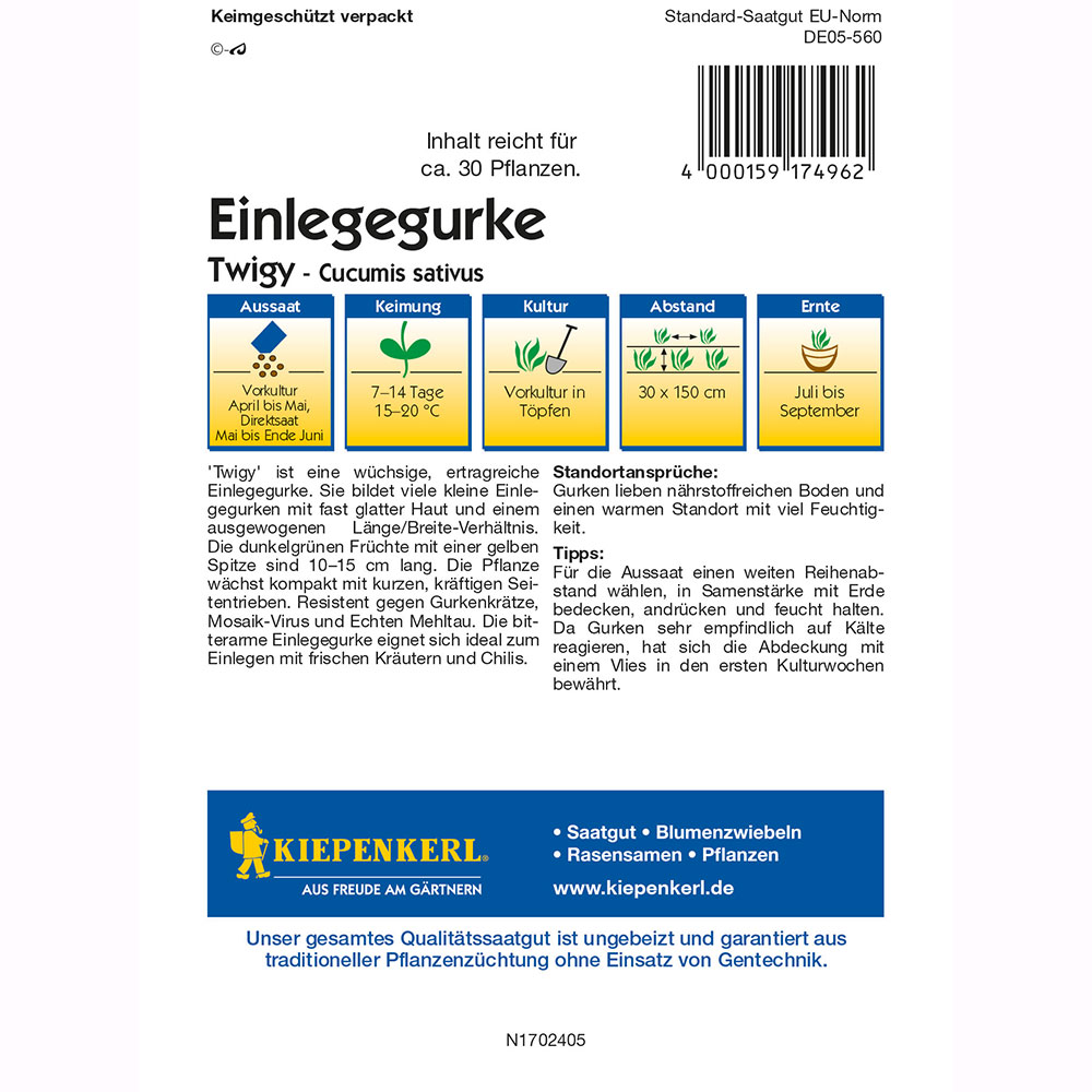 Csomag tartalma: 1 db A Kiepenkerl savanyú uborka Twigy F1 egy alacsony keserűségű, erőteljes és magas hozamú uborka, amely ellenáll az uborka varasodásnak, a mozaikvírusnak és a lisztharmatnak. A finom, szinte sima héjú uborka sok apró, sötétzöld, sárga hegyű gyümölcsöt formál, amelyek akár 15 cm-re is megnőhetnek. Az uborka Twigy F1 friss fogyasztásra és kulináris alkotásaihoz egyaránt alkalmas. A pácolás friss fűszernövényekkel és chilivel különösen ajánlott.