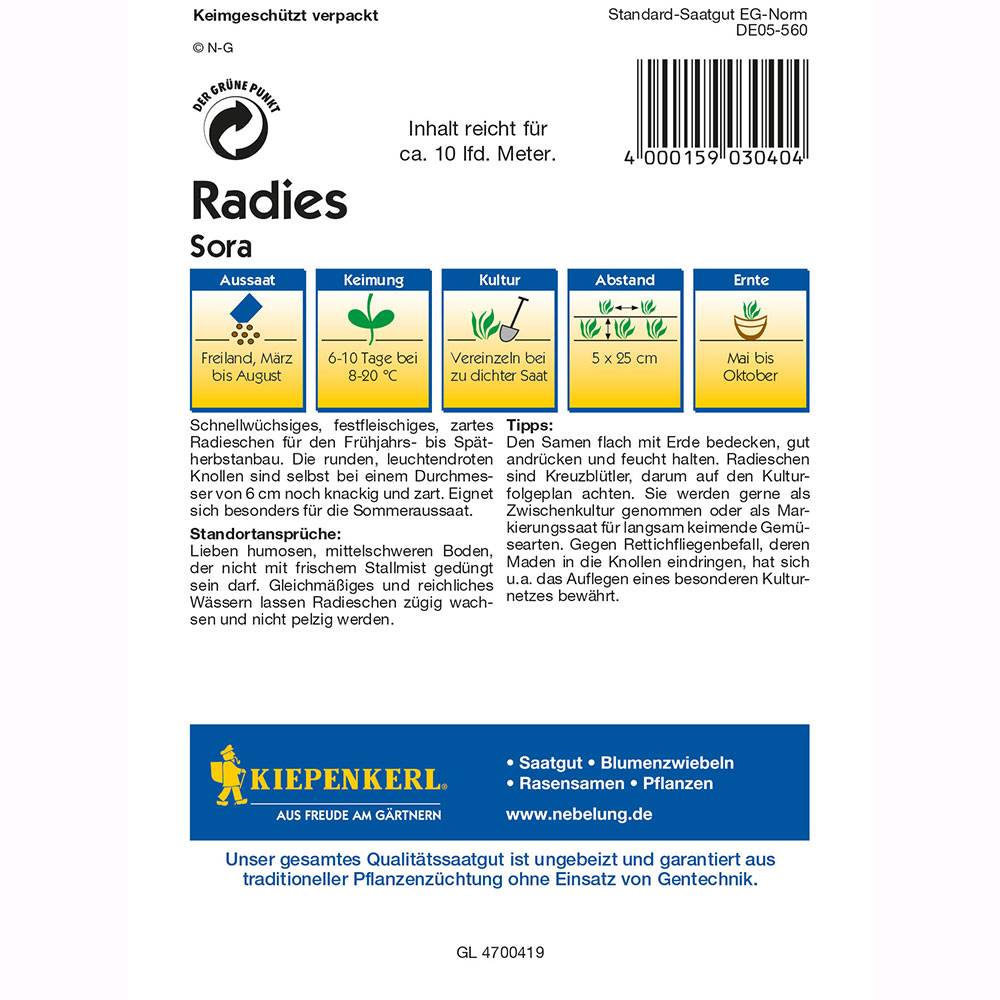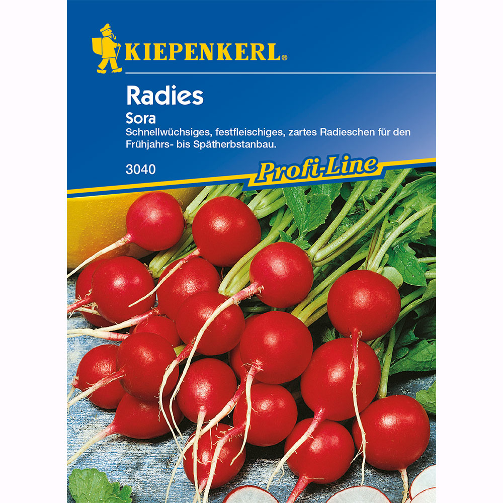 Csomag tartalma: 1 db A kiepenkerli Sora retek egyike azon különösen gyorsan növekvő retekfajtáknak, amelyek gyümölcsei kemény húsuknak és finom ízüknek köszönhetően sokféle felhasználásra alkalmasak az Ön konyhájában. Az élénkpiros gumók frissen fogyasztják, de a Sora retek salátákba vagy köretként is jólesik. A retek átmérője elérheti a 6 cm-t. A csomag tartalma körülbelül 10 futóméterre elegendő.
