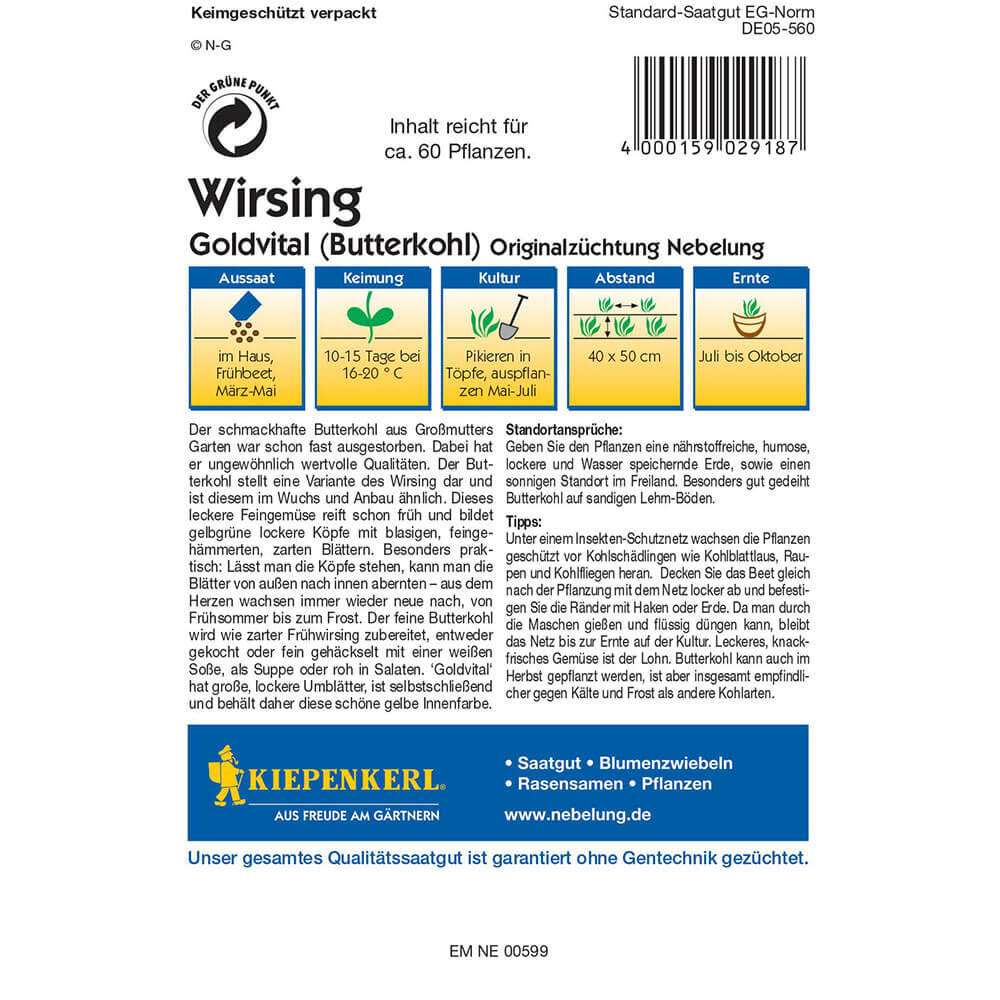 Csomag tartalma: 1 db A Goldvital kelkáposzta növények erős növekedéssel és dús lombozattal büszkélkednek. A kelkáposzta arany sárga levelei nemcsak látványosak, hanem gazdagok vitaminokban és ásványi anyagokban is. Tehát ez a kelkáposzta hozzájárul az egészséges táplálkozáshoz, és különleges ízt ad ételeinek. Egy csomag 60 db magot tartalmaz.