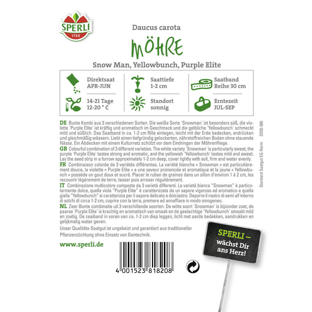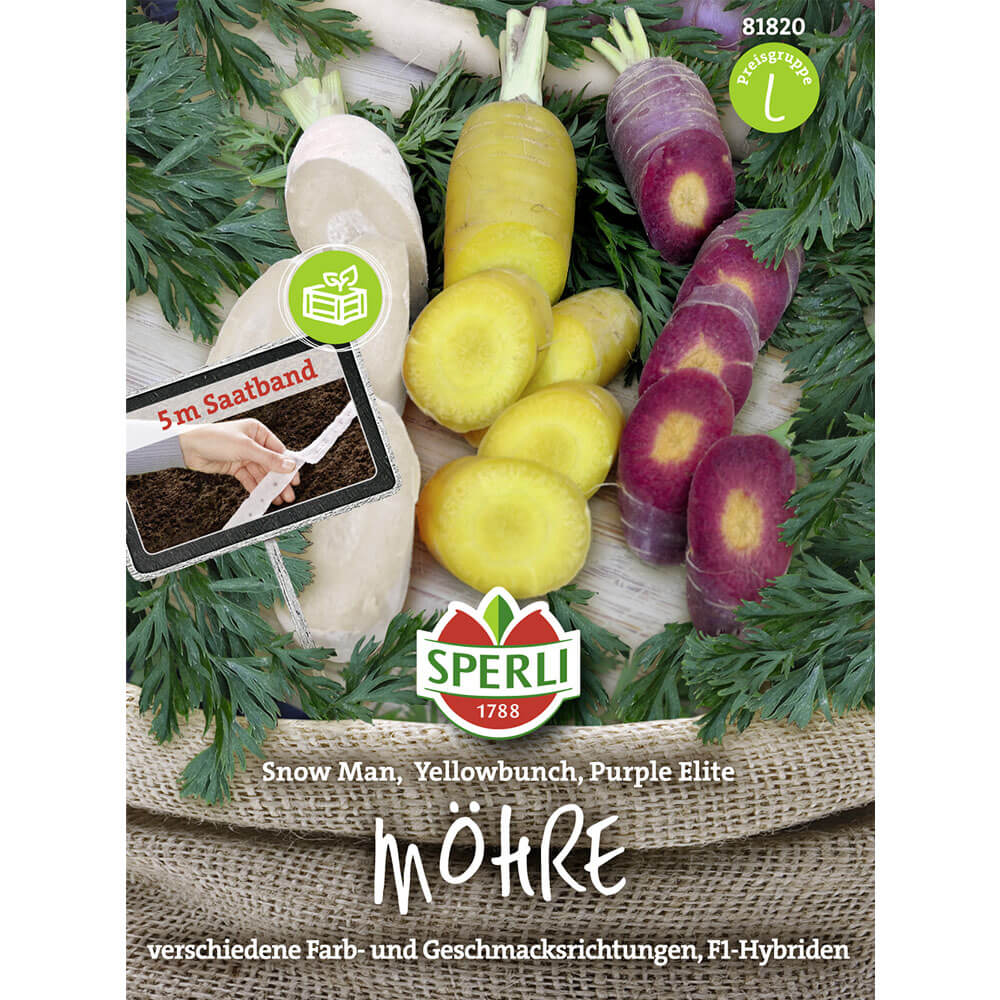 Csomag tartalma: 1 db Különleges szín és ízvilág. : A 'Snow Man' fehér színű, különösen édes, a 'Purple Elite', amint a neve is mutatja, lila sárgarépa és erősen aromás. A sárgás „Yellowbunch”, enyhén édes ízű. 5 m vetőszalag.